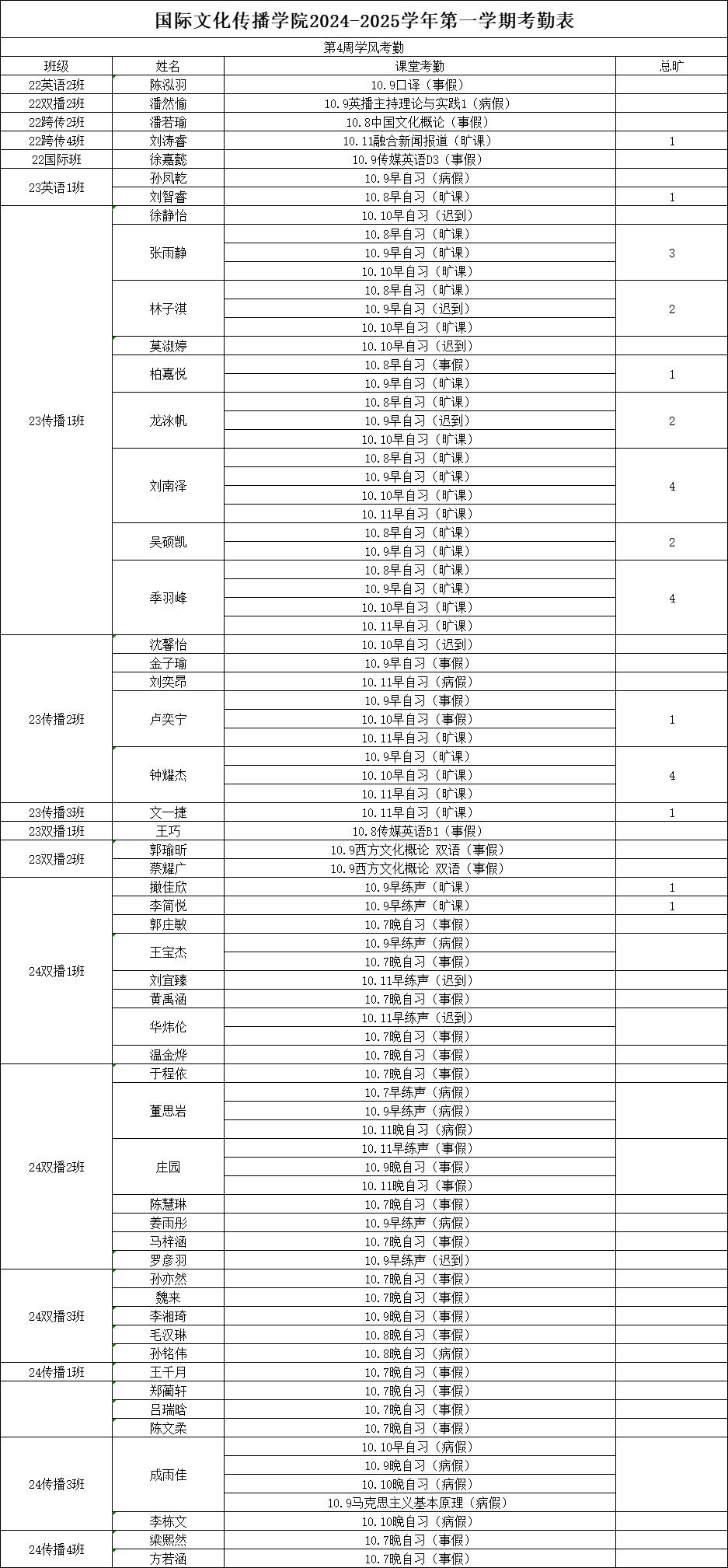 国传 · 考勤|2024-2025学年第一学期第4周学风督察情况公示