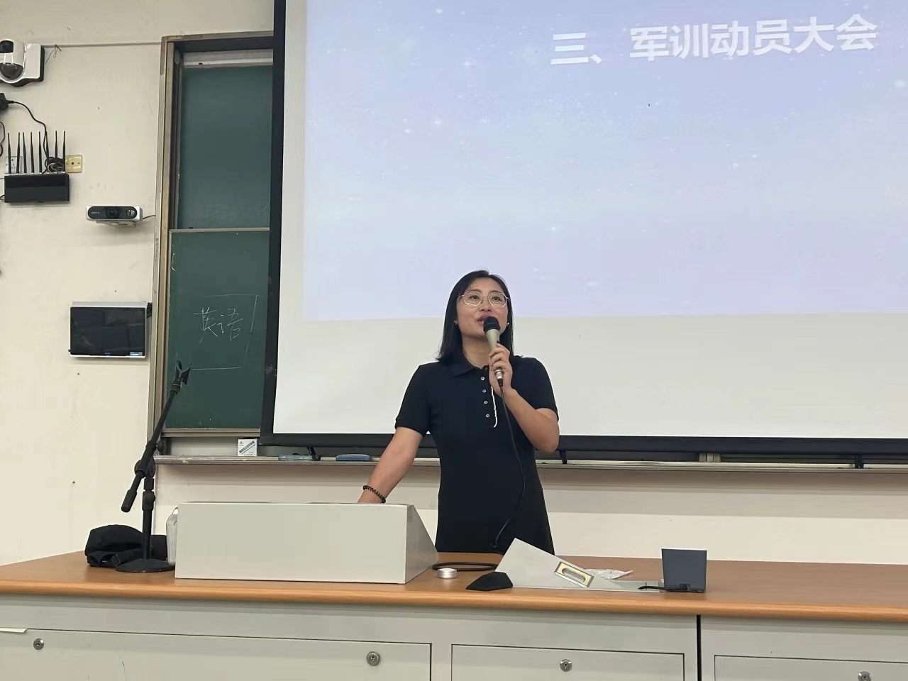学工办辅导员陈晓倩老师为新生们强调了军训的纪律,介绍了军训期间的各项活动,要求同学们做到“不迟到、不早退、不旷训”,并做好军训期间的内务整理,鼓励大家完成好军训的第一课。